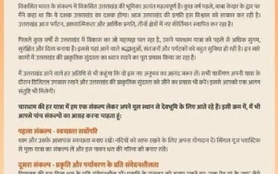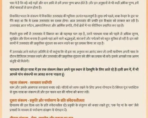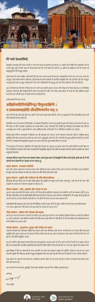 प्रधानमंत्री नरेंद्र मोदी ने चारधाम यात्रा शुरु होने पर देशवासियों को शुभकामना संदेश देते हुए, उत्तराखंड आने वाले तीर्थयात्रियों से पांच संकल्पों का पालन करने का आग्रह किया है। केदारनाथ धाम के कपाट खुलने पर प्रेषित अपने संदेश में प्रधानमंत्री ने कहा कि – देवभूमि उत्तराखंड की पावन धरती पर चारधाम यात्रा का शुभारंभ हो…